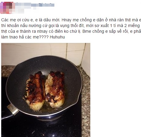 Ngày 8/8, trên mạng xã hội xuất hiện lời cầu cứu của một nàng dâu mới về nhà chồng. Theo đó, chị này đăng hình ảnh một chảo thịt được mẹ chồng giao trọng trách rán giòn. Tuy nhiên, trong phút giây lơ là, cô dâu trẻ đã khiến cho nồi thịt cháy khét. Chị vội vàng lên mạng xin mọi người cách khắc phục.