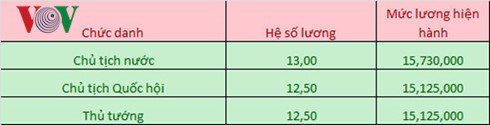 Các văn bản này cũng nêu rõ mức lương đối với các chức danh lãnh đạo quy định hai bậc lương như: Phó chủ tịch nước; Phó chủ tịch Quốc hội; Phó Thủ tướng Chính phủ; Chánh án Toà án nhân dân tối cao; Viện trưởng Viện kiểm sát nhân dân tối cao; Uỷ viên Uỷ ban Thường vụ Quốc hội; Chủ tịch Hội đồng dân tộc; Chủ nhiệm Uỷ ban của Quốc hội; Bộ trưởng, Thủ trưởng cơ quan ngang bộ; Chủ nhiệm Văn phòng Chủ tịch nước, Chủ nhiệm Văn phòng Quốc hội. Cụ thể như sau: