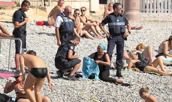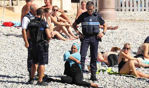 VBF-Những bức ảnh được lan truyền mới đây tại Pháp cho thấy mức đồ đề phòng nguy cơ khủng bố của cảnh sát đang ở mức cao nhất. Một phụ nữ Hồi giáo đã bị 1 nhóm cảnh sát buộc phải cởi bỏ trang phục với lý do không phù hợp đã gây nên những ý kiến trái chiều nhau.Theo Express, trong các tấm ảnh gây sốc, 4 cảnh sát lực lưỡng, được trang bị dùi cui và bình xịt hơi cay tiến gần một phụ nữ Hồi giáo, yêu cầu bà này lột áo bơi che kín từ đầu tới chân kiểu Hồi giáo (burkini) hoặc sẽ bị phạt.