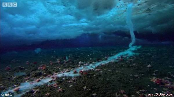 Hiện tượng brinicle, hay còn gọi là “ngón tay tử thần”, thực chất là một khối nước mặn cực lạnh bị chìm xuống đáy biển và khiến nước biển xung quanh nó cũng bị đóng băng theo.
