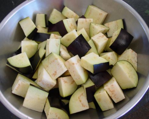 Trước tiên, hãy rửa cà tím và thái nó thành những lát mỏng. Sau đó, cho cà tím vào nồi nước sôi (đun 1 lít nước đã chuẩn bị).
