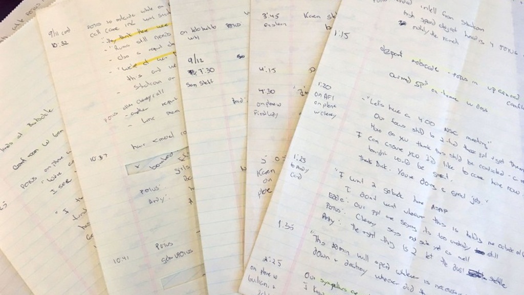 Trong 6 trang tốc ký, ông Fleisher ghi lại bản gốc nguyên văn những gì tổng thống Bush nói trên chuyên cơ Air Force One (Không lực 1).