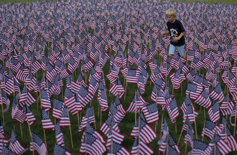 Cậu bé George Betsill đi qua khu vực cắm khoảng 3.000 lá cờ cắm ở công viên Winnetka, bang Illinois, tương ứng với số nạn nhân thiệt mạng do vụ không tặc ngày 11/9 gây ra.