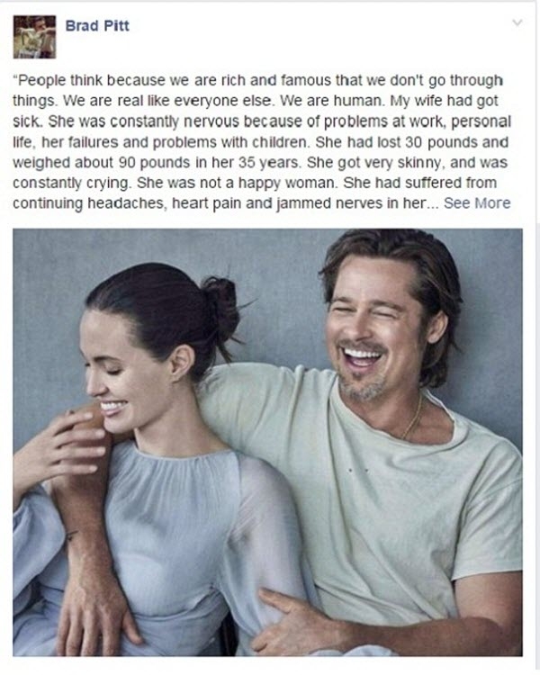 Cuối tháng 2/2016, Brad Pitt đã bất ngờ chia sẻ bức thư tình gửi tới cô vợ thân yêu của mình mà anh viết hồi tháng 3/2012 trên trang cá nhân. Xuyên suốt bức thư là những suy nghĩ và tình cảm sâu đậm của tài tử điển trai dành cho Angelina Jolie.