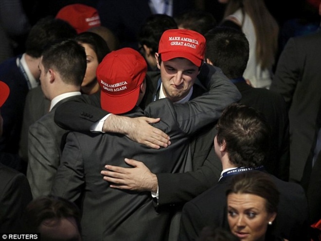 Những người ủng hộ Trump cởi bỏ chiếc mũ in câu khẩu hiệu quen thuộc trong chiến dịch tranh cử của nhà tài phiệt New York - "Khiến nước Mỹ vĩ đại trở lại" - cùng chia vui.