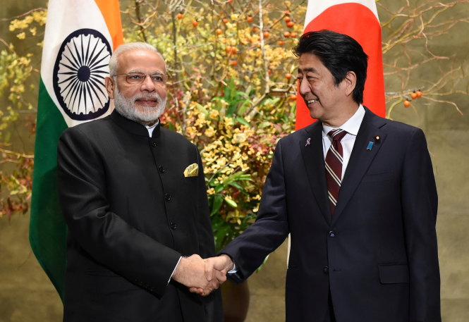 Thủ tướng Nhật Shinzo Abe (phải) tiếp người đồng cấp Ấn Độ Narendra Modi tại Tokyo ngày 11-11. Hai lãnh đạo cho rằng mối quan hệ bền vững sẽ cho phép 2 quốc gia góp phần vào sự ổn định tại khu vực châu Á - Ảnh: Reuters