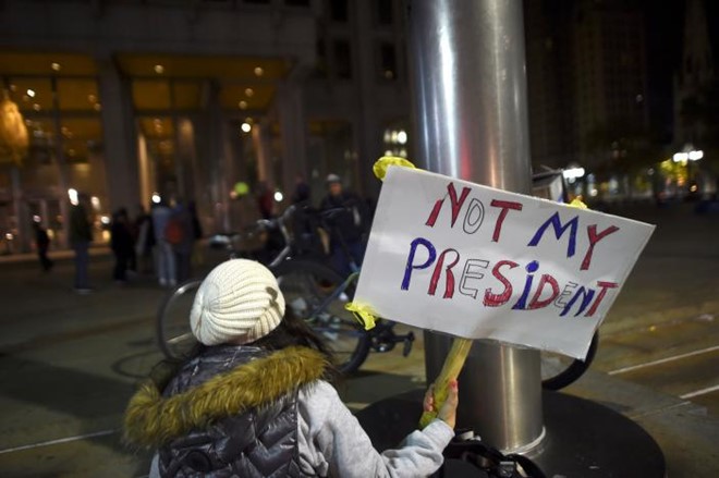 Hàng chục nghìn người tuần hành tại các thành phố từ New York ở bờ Đông sang Los Angeles ở bờ Tây, kể từ khi tỷ phú Trump "đánh bại" ứng viên đảng Dân chủ Hillary Clinton. Các cuộc biểu tình ôn hoà nhanh chóng biến thành cuộc bạo loạn khi người tham gia ném các vật dụng vào cảnh sát, đập phá cửa hàng và đốt xe hơi bên đường. Ảnh: Getty