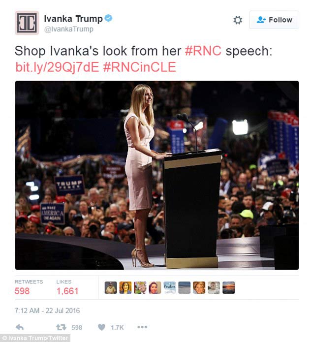 Trước đó, Ivanka cùng từng bị chỉ trích vì quảng cáo chiếc váy trị giá 138USD mà cô mặc trong Hội nghị Toàn quốc đảng Cộng hòa trên Twitter. Công ty thời trang của cô sau đó đã bán sạch mẫu váy này trong chốc lát.