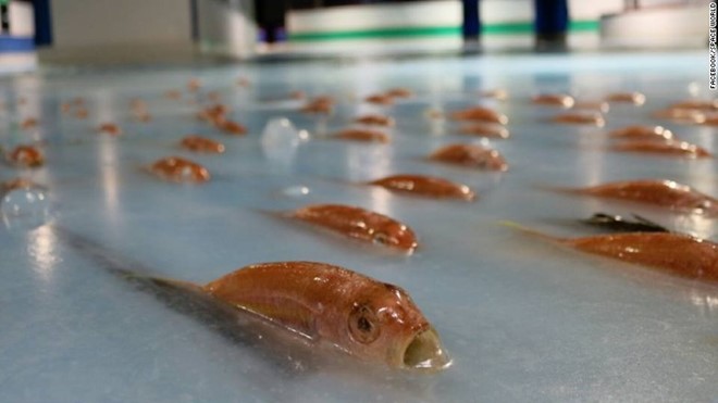 Space World, một công viên giải trí tại Nhật Bản, hứng chịu làn sóng chỉ trích dữ dội sau khi sử dụng cá sống ướp đông lạnh để trang trí mặt băng.