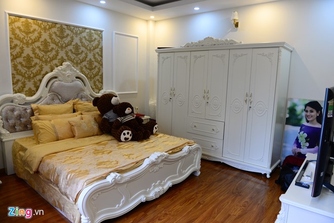 Phòng ngủ điệu đà của Tố My nằm ở tầng 1. Nữ ca sĩ cho biết cô thường xuyên đi diễn trong và ngoài nước nên chưa có thời gian trang trí ngôi nhà đúng như ý mình. Phòng ngủ của em gái Tố Ny nằm trên tầng 2. Tầng trên cùng dành cho phòng thu và phòng tập.