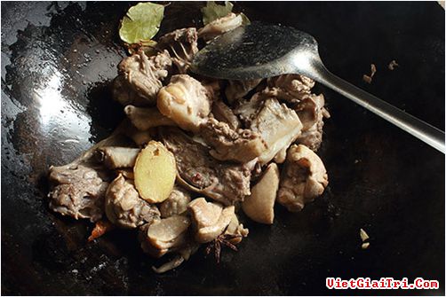 Bước 2: Làm nóng chảo với một ít dầu, cho vịt vào xào chín. Sau đó thêm gừng xắt lát, lá quế, ớt, hoa hồi vào xào cùng. Nêm nếm gia vị cho vừa ăn.