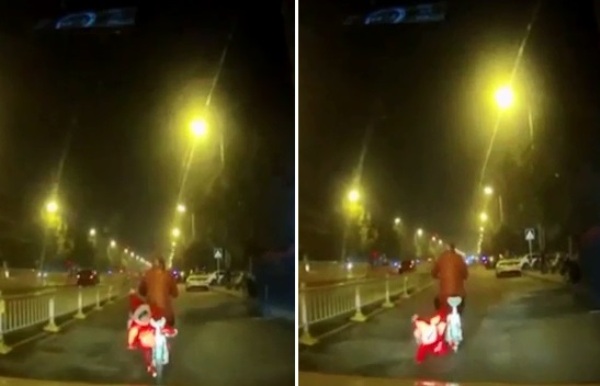 Đoạn video được ghi lại vào khoảng 8 giờ tối ngày 28/12 trên một con phố khá vắng vẻ. Theo đó, có thể thấy một bà mẹ trẻ đang vui vẻ đèo cô con gái nhỏ về nhà trên chiếc xe đạp điện quen thuộc của mình.