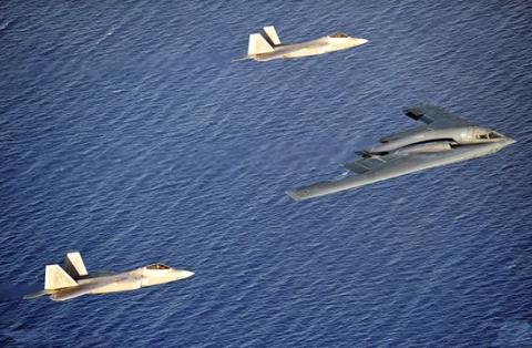 Lực lượng tấn công tàng h́nh Không quân Mỹ gồm máy bay chiến đầu F-22 Raptor và máy bay ném bom chiến lược B-2. Ảnh: Viettimes