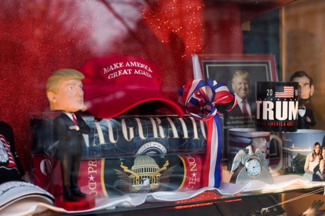 Một quầy bán áo phông và mũ ăn theo sự kiện này mọc lên ở trạm xăng tại Đồi Capitol, Washington.