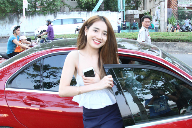 Vì chiếc áo hai dây quá trễ nải, Nhã Phương phải lấy tay che ngực khi cúi xuống.