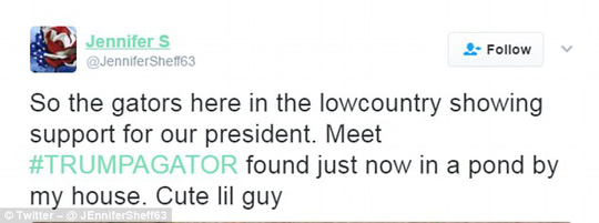 Theo thông tin được Daily Mail đăng tải hôm 10/2, cư dân địa phương gọi con cá sấu màu cam dài khoảng 1,5 mét nói trên là “Cá sấu Trump” bởi vì màu sắc của nó khá giống với... màu da của Tổng thống Donald Trump. Một số người dùng mạng còn nói đùa rằng con cá sấu leo lên bờ để thể hiện sự ủng hộ cho ông Trump.