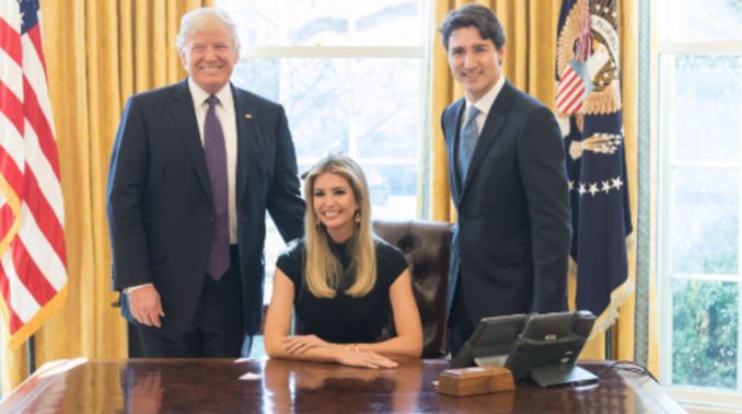 Bức ảnh trên do Ivanka Trump đăng trên mạng Xã hội Twitter hôm 13/2, trong đó ái nữ nhà Trump ngồi trên chiếc ghế bọc da, vốn dành riêng cho Tổng thống Donald Trump trong Phòng Bầu Dục tại Nhà Trắng. Đứng kế bên cô là cha và Thủ tướng Canada Justin Trudeau. Cả 3 người trong bức ảnh đều tươi cười rạng rỡ.