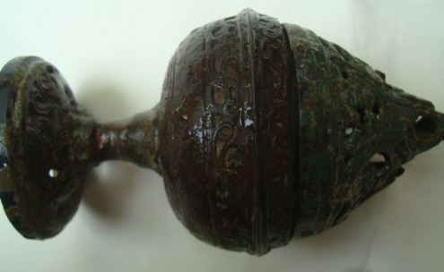 Khi đưa quan tài trở lại vị trí cũ, đáy quan tài đã chạm phải một vật cứng, đào lên phát hiện đó là một vật bằng sắt, chàng trai liền đem vật này về nhà. Sau khi rửa sạch sẽ phát hiện vật này có hình dạng rất đặc biệt, phần trên giống hình quả đào, mọi người trong thôn nhìn thấy đều nhận định đây không phải một vật bình thường, có lẽ là một cổ vật.