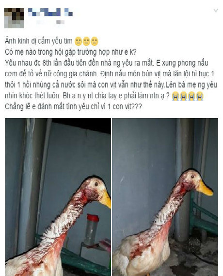 Chứng kiến cảnh tượng này, cô gái chia sẻ: "Mẹ người yêu nhìn khóc thét. Bây giờ anh người yêu nhắn tin chia tay thì em phải làm như thế nào ạ? Chẳng lẽ em đánh mất tình yêu chỉ vì 1 con vịt?”.