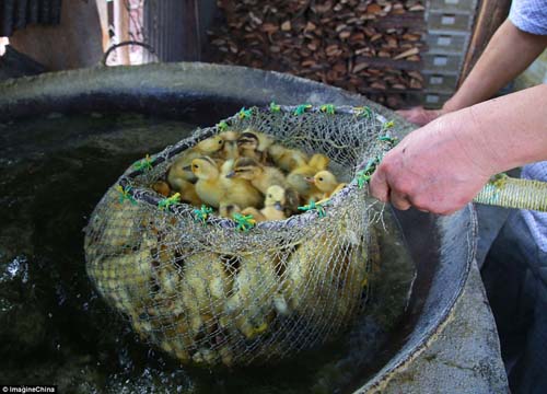 Theo Daily Mail, những bức ảnh chụp tại Trung Quốc, do tổ chức bảo vệ động vật (PETA) công bố, cho thấy cảnh công nhân dùng vợt h́nh phễu để luộc sống những vịt con.