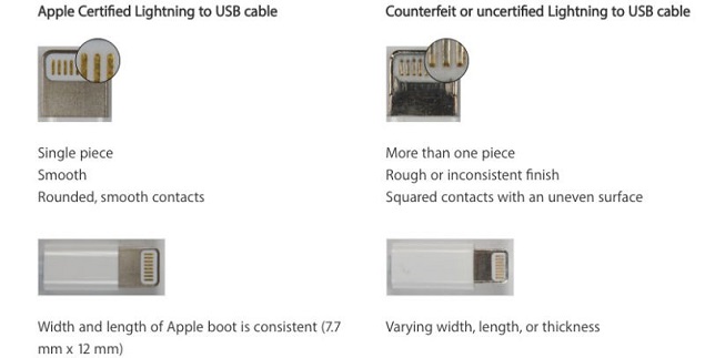 Chất lượng dây là một trong những điểm then chốt để đánh giá là đây là hàng thật hay nhái. Đối vối hàng thật, các chi tiết đều được làm kỹ lưỡng, thậm chí ngay cả phần tiếp xúc kim loại cũng được làm vừa với kích thước khe cắm của điện thoại, trong khi đó sản phẩm nhái sẽ bị dư ra.