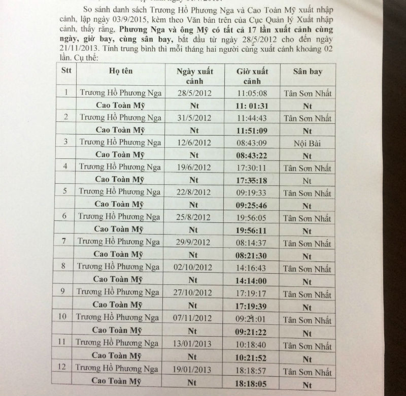 Cụ thể, quá tŕnh điều tra vụ án, cơ quan CSĐT Công an TP.HCM đă có văn bản gửi cục Quản lư Xuất nhập cảnh (A72), Bộ Công an để xác minh những chuyến bay của ông Mỹ, lẫn Phương Nga. Từ những thông tin có được, luật sư nghi vấn về sự trùng hợp kỳ lạ, Phương Nga và ông Mỹ có 17 lần xuất cảnh cùng ngày, cùng giờ và cùng sân bay trong giai đoạn ngày 28/5/2012 đến 21/11/2013.