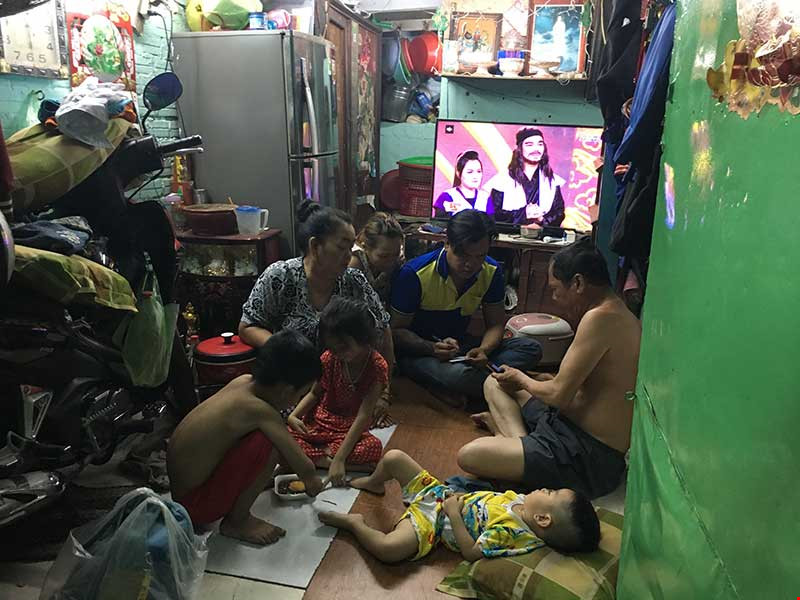 7 giờ tối, thời điểm tập trung đông đủ nhất của các gia đ́nh. Tôi ghé thăm nhà ông Huỳnh Trung Nghĩa khi ông vừa trở về sau cuốc xe ôm cuối cùng trong ngày. Lúc này trong nhà đă có sẵn sáu người, một lúc sau th́ có thêm hai vợ chồng bế một cháu nhỏ về nhà. Tôi c̣n chưa hết ngạc nhiên th́ ông Nghĩa nói tỉnh rụi: “C̣n năm đứa nữa, đi làm chưa về!”.