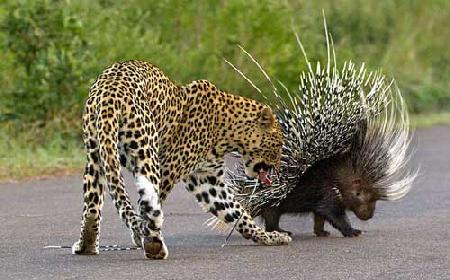 Con báo đốm tham ăn vồ ngay con nhím tiến đến đầu tiên trước khi điều chỉnh tư thế để nhắm vào con nhím theo phía sau. Cú vồ mồi chưa căn chuẩn thời cơ của báo đốm cho phép con nhím có đủ thời gian để chĩa những chiếc gai nhọn về phía kẻ thù. Cuộc tấn công kết thúc chớp nhoáng với kết cục thảm hại dành cho báo đốm.