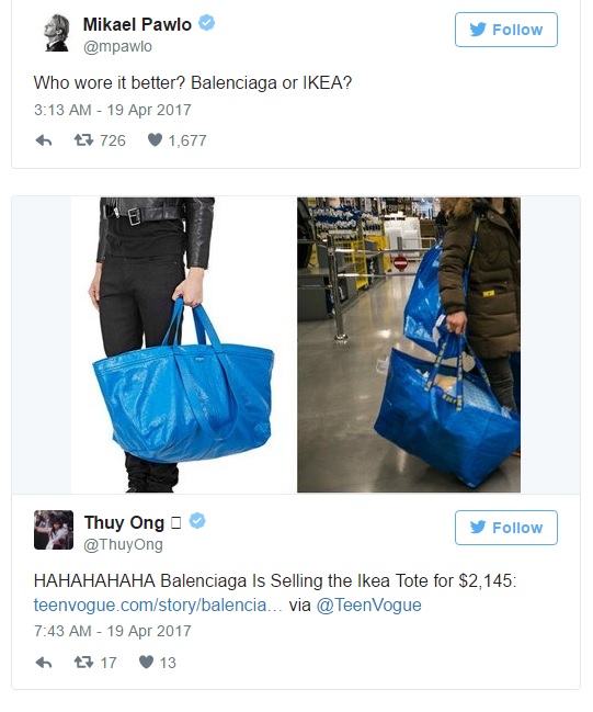 Cư dân mạng cho rằng nhà mốt lớn đã "đạo nhái" mẫu mã. Nhiều bình luận hài hước được đưa ra: " Balenciaga và IKEA mẫu túi nào tốt hơn?" hay " Balenciaga bán giảm giá chiếc túi của IKEA với giá 2.145$.