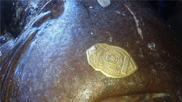 Huy hiệu vàng này được cho là của một nhân viên an ninh xấu số đã bị cá mú này nuốt mất. Cũng không thể loại trừ khả năng là nhân viên này bị mất tích trên biển và cái mà con cá mú này nuốt vào bụng chỉ là cái xác của họ.