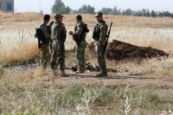 Các thành viên của lực lượng tự vệ người Kurd đứng cạnh thi thể một kẻ đánh bom tự sát IS ngày 7.5