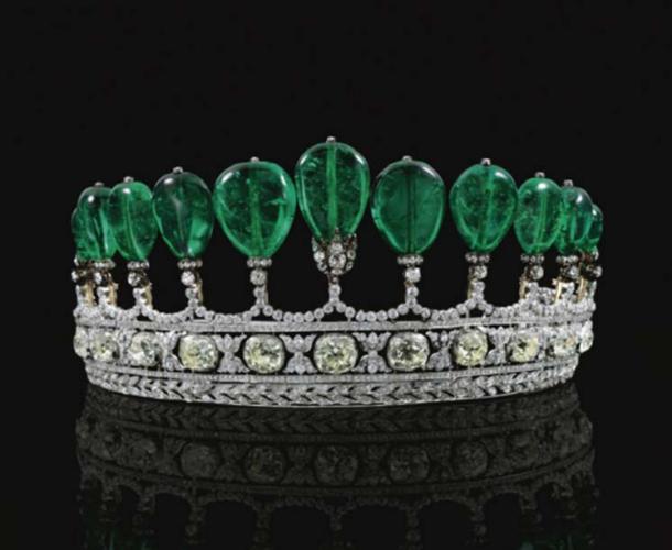 Vương miện này nạm 11 viên ngọc lục bảo quý hiếm từ Colombia với độ trong hoàn hảo, tổng trọng lượng lên tới 500 carat. Hoàng tử Đức Guido Henckel đã yêu cầu đúc món trang sức này cho vợ là công nương Katherine Henckel. Theo huyền thoại những viên ngọc từng nằm trên vòng cổ của một hoàng tử Ấn Độ. Chủ nhân sau này của chiếc vương miện là Eugenie de Montijo, vợ vua Napoleon III. Cuối cùng, nó về tay một nhà sưu tầm hồi tháng 5.2011.