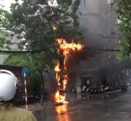Người dân sống quanh cột điện có một phen hoảng loạn. Trời đang mưa lớn thì bất cơ cột điện lại bốc cháy. Chỉ trong thời gian ngắn toàn bộ dây điện đã bị thiêu rụi.