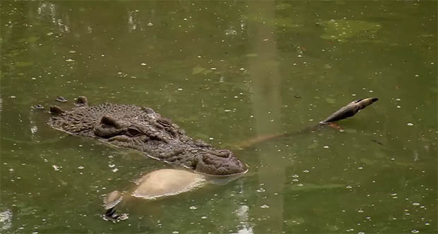 Một số người nói con cá sấu thể hiện tài năng trước ống kinh camera. Số khác cho rằng, con mồi khá lớn nên cá sấu phải xé đôi để ăn dần.