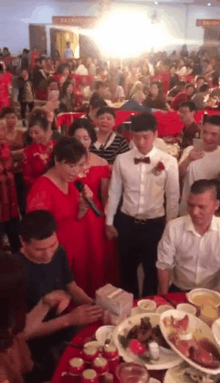Người dẫn chương trình không ngừng hét lớn "500.000 tệ" (tương đương 1,6 tỷ đồng) khi thấy những cọc tiền được đặt ngay ngắn trên bàn tiệc. Còn cặp đôi mới cưới thì cúi người cảm tạ không ngơi nghỉ.