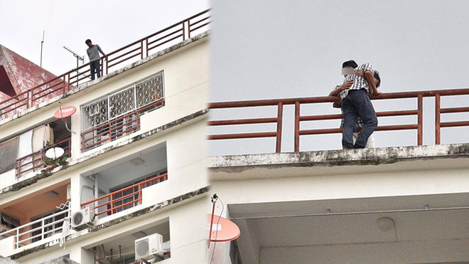 Ngay lập tức, cảnh sát đã có mặt tại hiện trường vụ việc và chứng kiến người đàn ông 31 tuổi sống tại tòa nhà này trèo ra lan can sân thượng tầng 9 từ lúc 8h sáng. Thấy vậy, cảnh sát và các nhân viên cứu trợ đã chuẩn bị đầy đủ tấm thảm đỡ ở dưới mặt đất để phòng trường hợp thầy giáo kia bất ngờ nhảy xuống.
