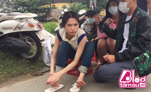 Có mấy ai ngồi ô tô rồi mà vẫn “bùm bịt” kín như bưng thế này? Tất cả là để bảo vệ làn da đã qua nhiều năm tắm trắng của cô.