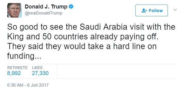 Tại Riyadh, lãnh đạo các nước Vùng Vịnh đã cam kết với Trump về các biện pháp cứng rắn nhằm chấm dứt các hoạt động tài trợ cho chủ nghĩa cực đoan. Tổng thống Mỹ Donald Trump nhấn mạnh trên trang Twitter của mình rằng, việc cô lập Qatar rất có thể sẽ "đặt dấu chấm hết chủ nghĩa khủng bố"