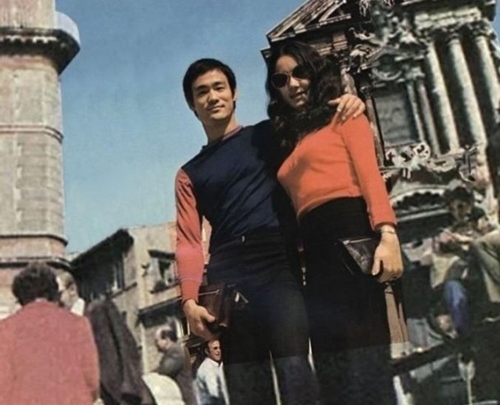 Lý Tiểu Long và Miêu Khả Tú chụp ảnh kỉ niệm bên ngoài đấu trường La Mã trong quá trình đóng phim "Mãnh Long quá giang".