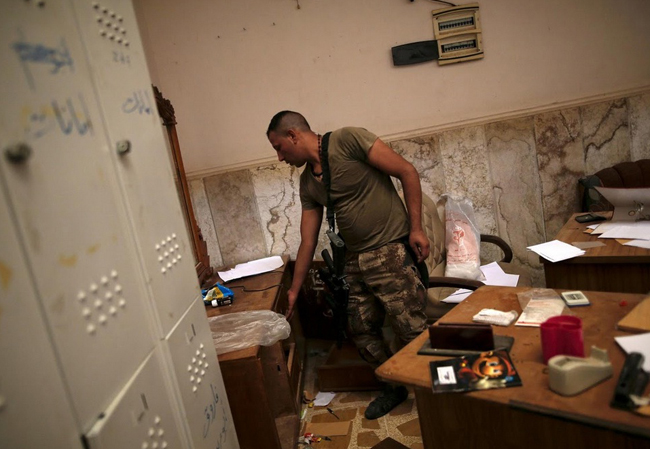 Một binh lính quân đội Iraq kiểm tra căn phòng nơi giam giữ các nữ tù nhân của IS.