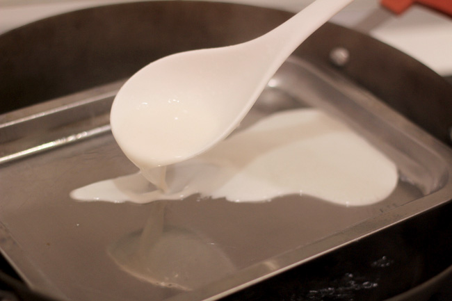 - Phết một chút dầu ăn lên khay, rồi múc một thìa bột đổ lên khay, láng đều để bánh mỏng và mịn.