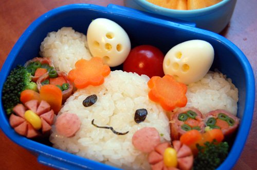 Các mẹ Nhật đặc biệt quan tâm đến đồ ăn cho con mang theo đến trường. Đồ ăn cho các bé đều tốt cho sức khoẻ và c̣n được trang trí bắt mắt để kích thích các con ăn ngon miệng. Cá, rau củ, đậu phụ, rong biển, cơm được tạo thành h́nh các con vật hoặc cây cối.