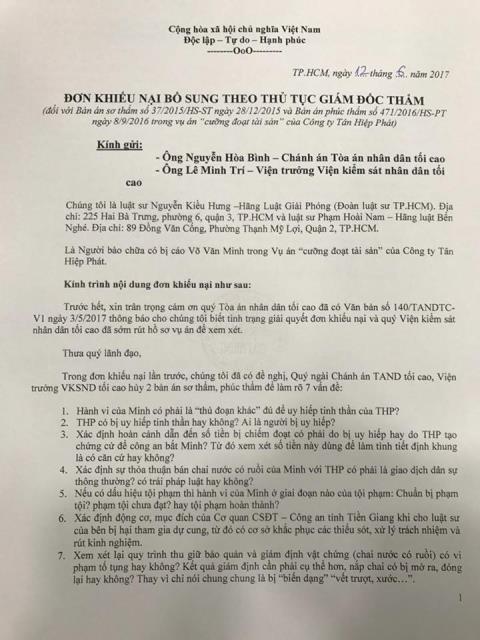 Tối 25/6, Luật sư Phạm Hoài Nam (Đoàn LS TP.HCM) xác nhận với Đất Việt, anh và LS Nguyễn Kiều Hưng (Đoàn Luật sư TP.HCM), người bào chữa cho bị can Võ Văn Minh (trú tại huyện Cái Bè, tỉnh Tiền Giang) trong vụ án cưỡng đoạt 500 triệu của Tân Hiệp Phát vừa gửi đơn đề nghị kháng nghị giám đốc thẩm bổ sung đối với vụ án này.