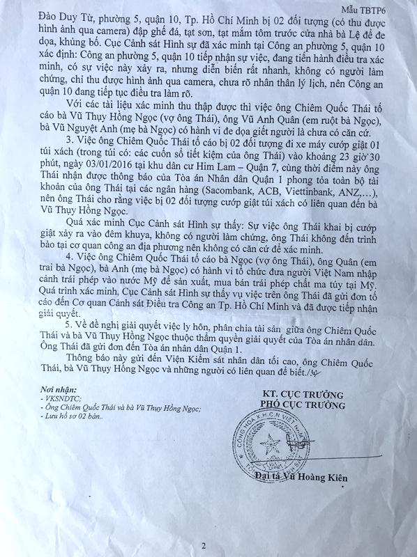 Cục cảnh sát h́nh sự (C45 - Bộ công an) đă kết luận việc bác sĩ Chiêm Quốc Thái tố cáo bà Vũ Thụy Hồng Ngọc (vợ) và mẹ, cùng em trai bà Ngọc có âm mưu đe dọa giết ḿnh, tổ chức cướp giật tài sản, sản xuất, tàng trữ , mua bán trái phép chất ma túy tại Mỹ... là không có căn cứ. Gần đây nhất, bác sĩ Thái đă bắn tiếng đ̣i chia 50 tỉ cho bà Ngọc.