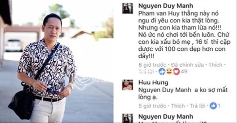Giữa vô số tranh luận, nam ca sĩ Duy Mạnh lại bày tỏ thái độ của mình bằng một bình luận khá sốc. Nam ca nhạc sĩ này thẳng thừng mắng Cao Toàn Mỹ "ngu" khi yêu hoa hậu vừa đen vừa xấu như Phương Nga. Anh cũng khẳng định với số tiền ấy, anh có thể có được cả trăm người yêu hơn hoa hậu Phương Nga. Cư dân mạng chia sẻ dòng bình luận của Duy Mạnh với tốc độ chóng mặt.