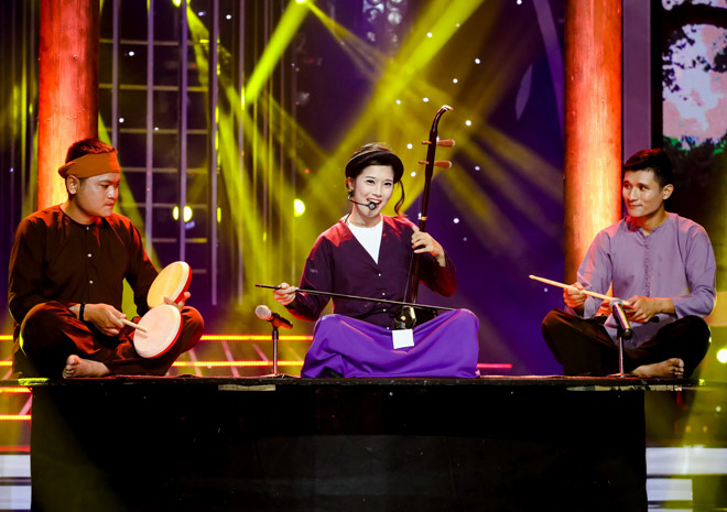 Hoàng Yến gây bất ngờ với khả năng hát xẩm và chơi đàn nhị trên sân khấu.