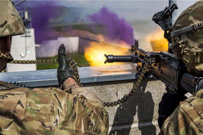 Các binh sĩ xả súng máy trong cuộc tập trận bắn đạn thật Saber Junction 17 tại thao trường Hohenfels, Đức.