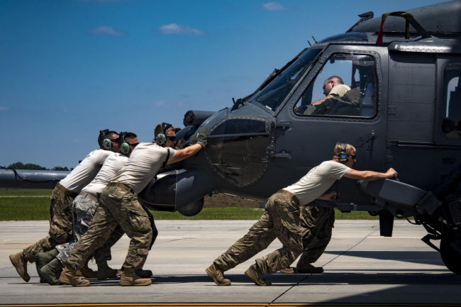 Các thành viên của đơn vị bảo dưỡng trực thăng số 41 đẩy một chiếc trực thăng HH-60G Pave Hawk lên máy bay vận tải C-17 Globemaster III tại căn cứ không quân Moody, bang Georgia.