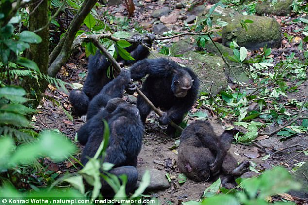 Được đăng trên Daily Mail ngày 1.8, video bắt đầu với cảnh nhóm tinh tinh nổi dậy quây quanh con đầu đàn, vật xuống đất và dùng cành cây đâm nó.