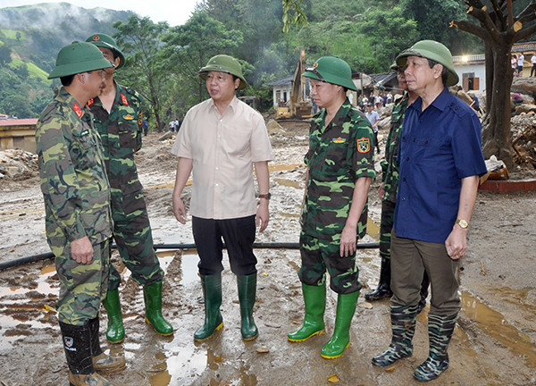 Bộ trưởng và đoàn công tác đã thăm hỏi, động viên các lực lượng tham gia tìm kiếm, cứu hộ cứu nạn khắc phục hậu quả trận lũ ống xảy ra ngày 3.8 làm 4 người chết, 11 người mất tích, tổng thiệt hại về tài sản ước tính lên tới 160 tỉ đồng.